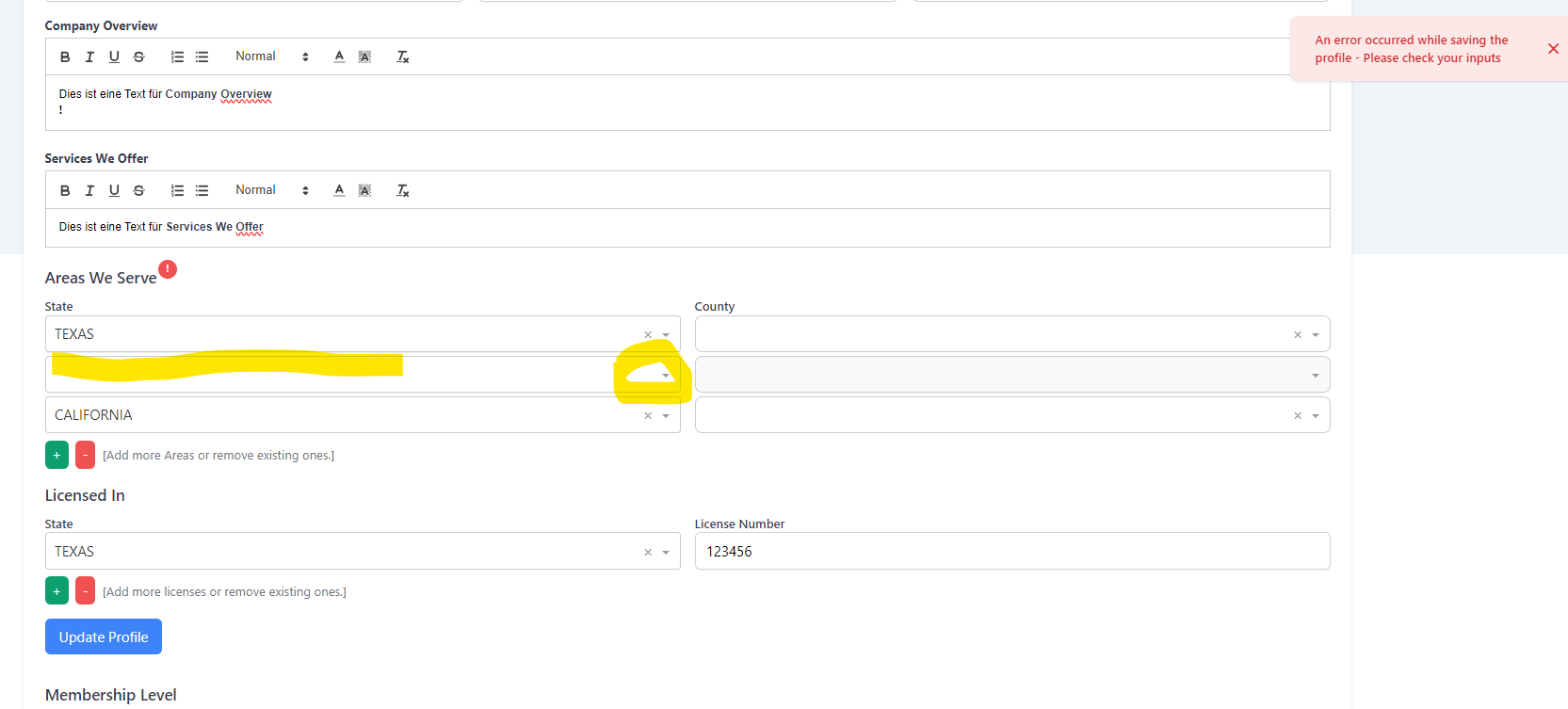 Profile - Delete Areas we serve über "x" #104