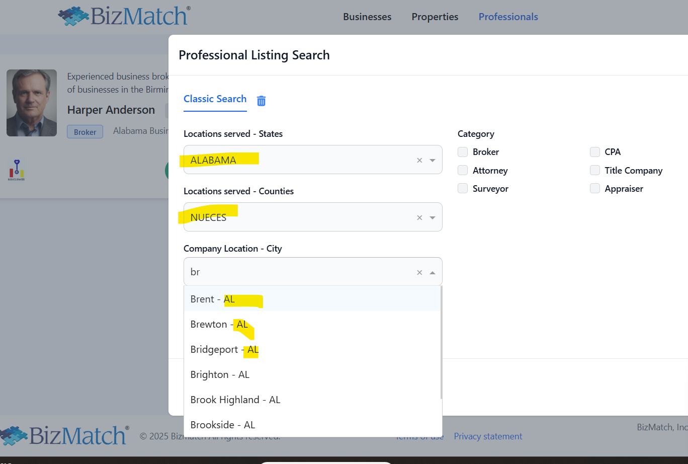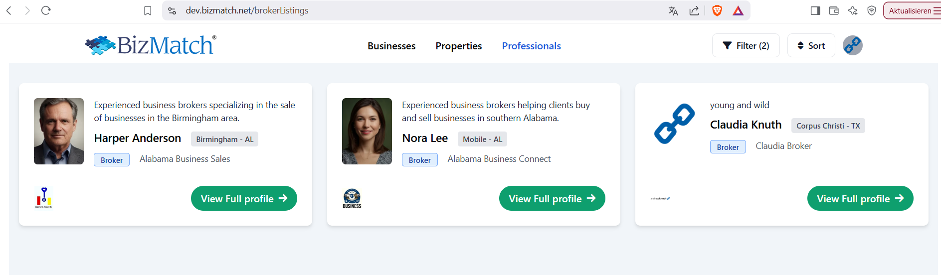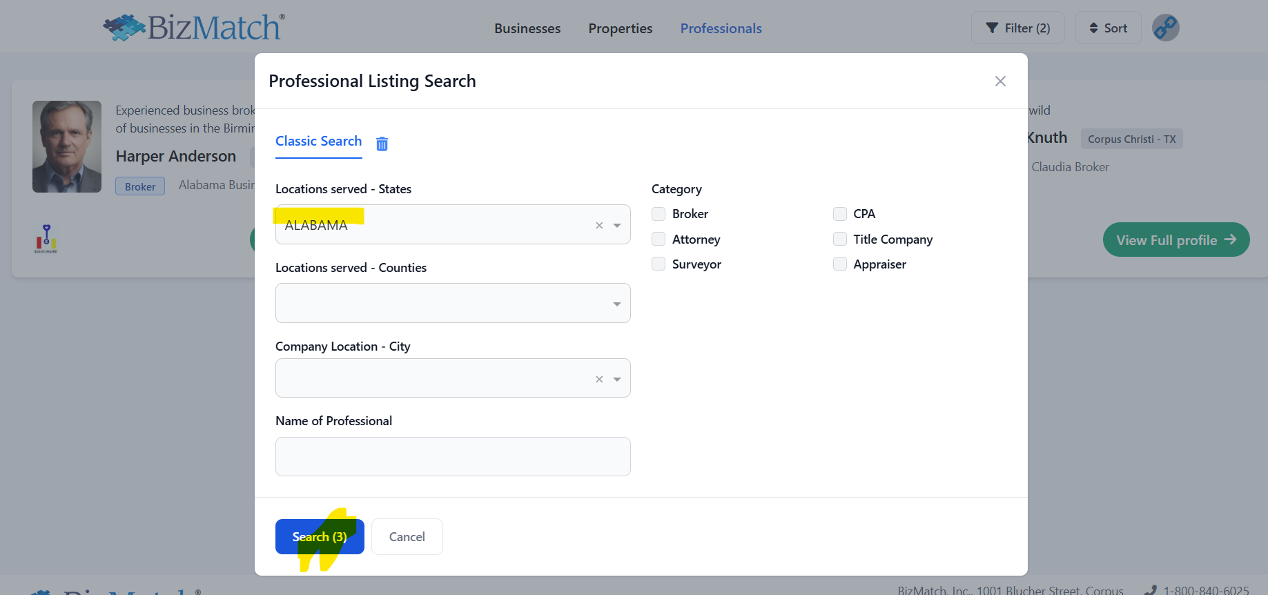 bei "Professionals" wird mit Filter "ALABAMA" 3 Einträge gefunden: