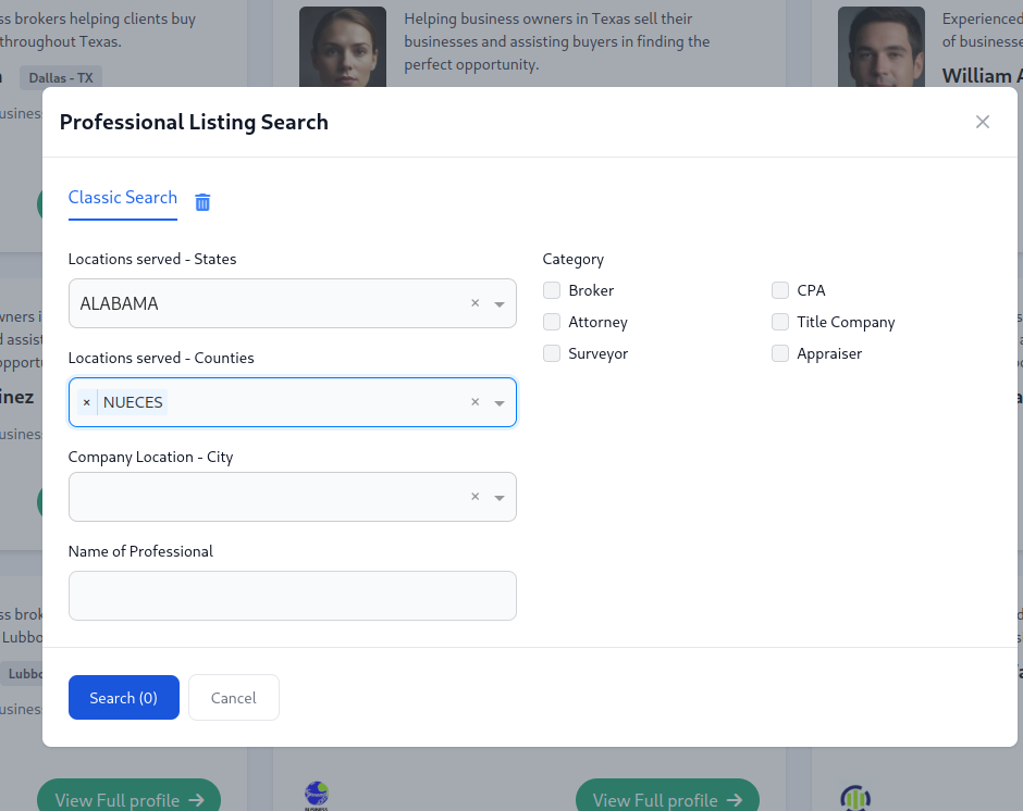 ABER, wenn ich "NUECES" mit dazu nehme (was in der Kombi mit Alabama nicht wählbar sein sollte, aber als zusätzliches Kriterium vielleicht ja auch etwas sinn machen würde), erfolgt mir "(0)" als Suchergebnis angezeigt:
