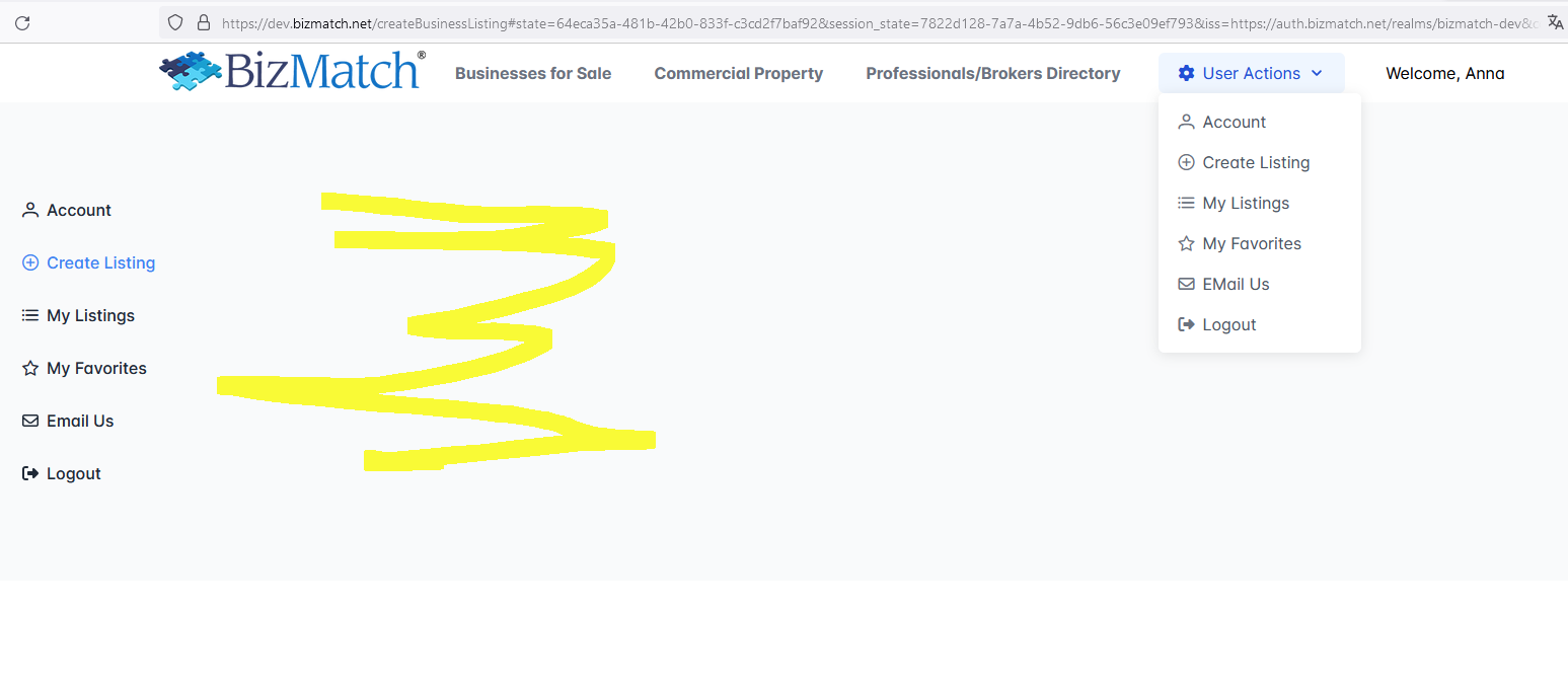 klicke ich erneut auf hier z.B. "Create Listings" dann wird die Seite normal wieder angezeigt.