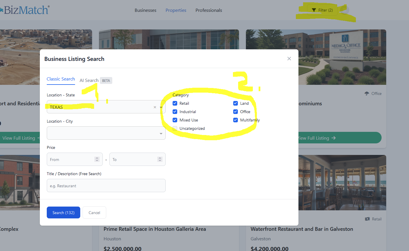 bei allen drei Bereichen (Bus.,Prop.,Prof.) verhält sich der Zähler gleich ... zusätzliche Angaben führen zu einem richtigen "Hochzählen" der Filterkriterien